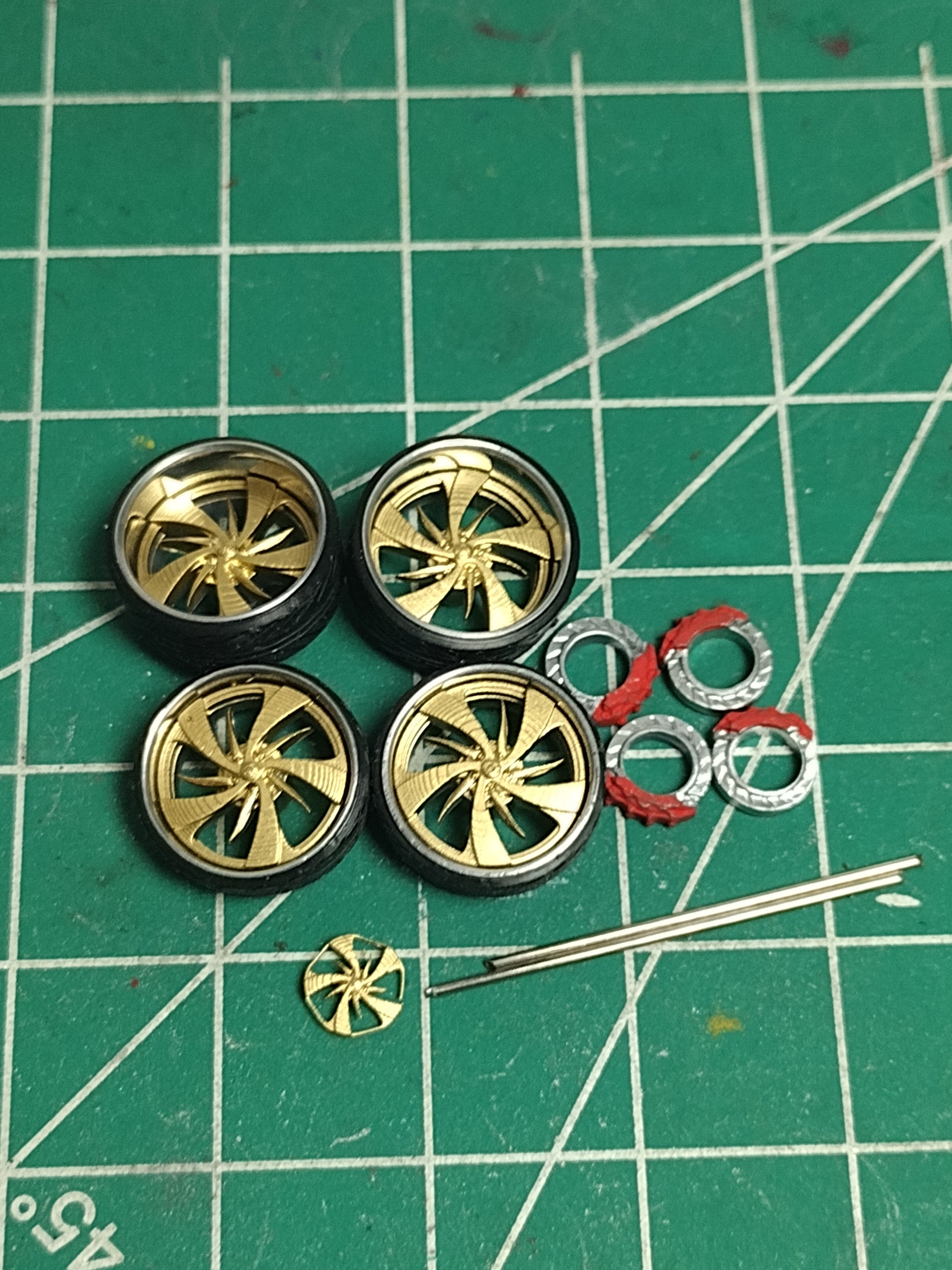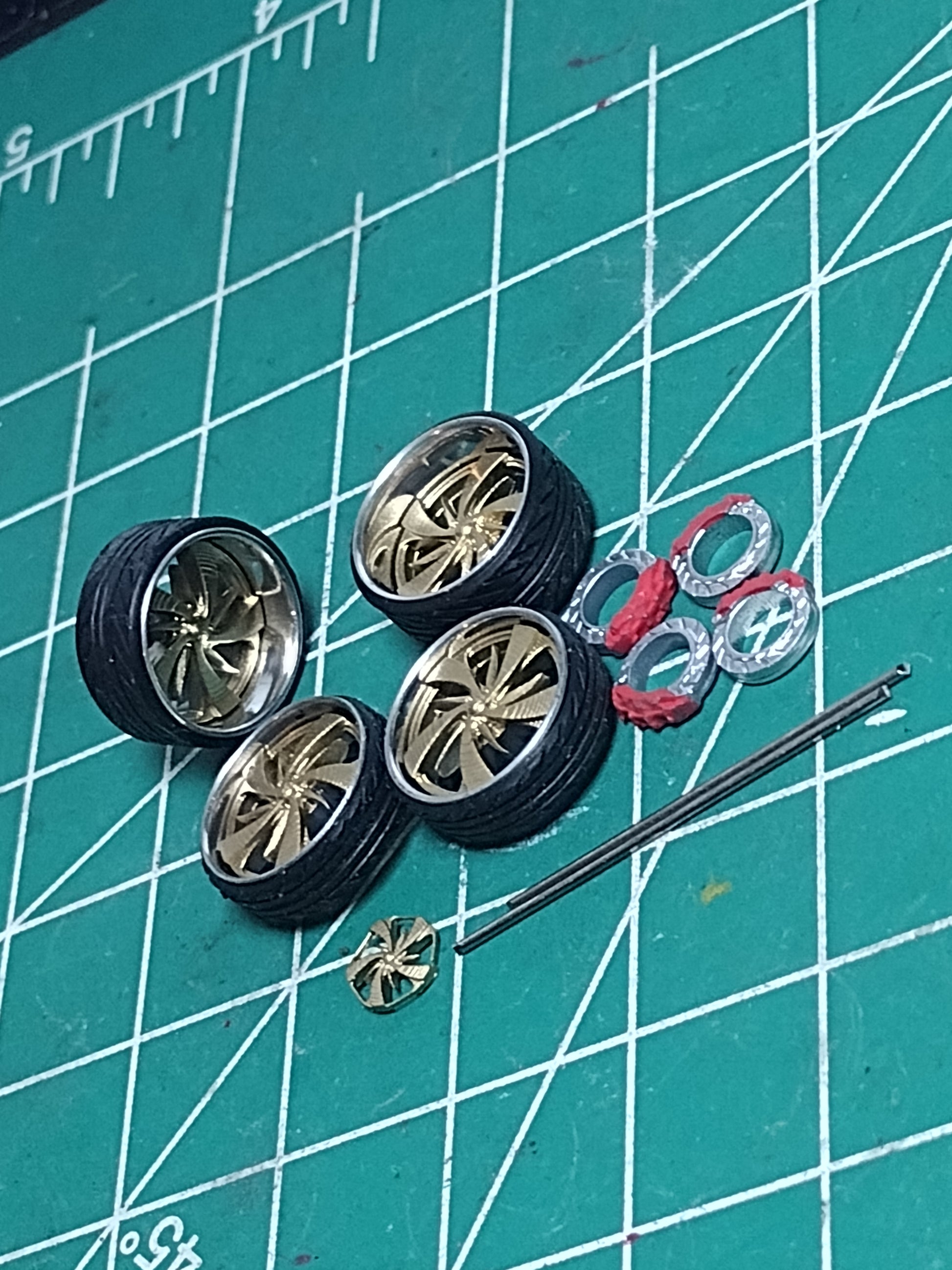 3d printed offset wheels 3d printed face polished aluminum barrel and rubber tires 1/64 scale wheels with brakes and axels included.